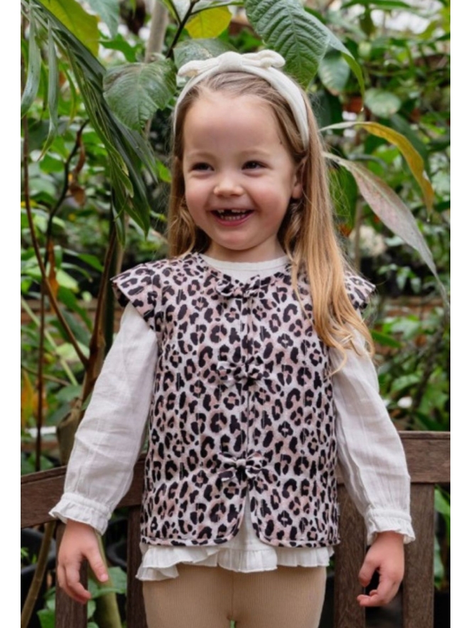 Dit pantergiletje is een fijne dunne. Met dit printje is jouw meisje helemaal hip en trendy. Voorop zitten drie strikjes met daarachter een haak oog sluiting. Leuk te combineren met een T-shirt of top op een flair broekje met daaronder leuke sneakers.