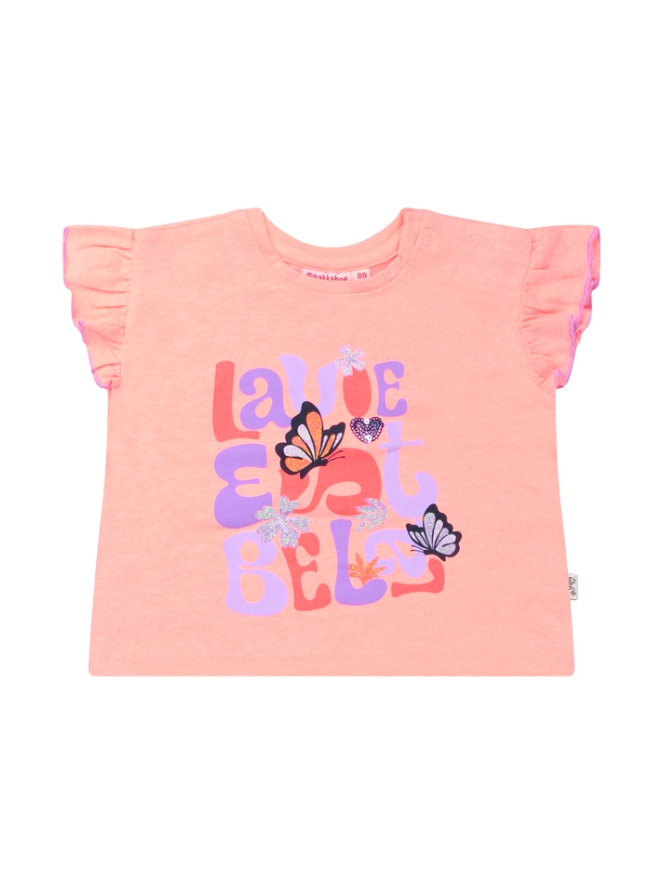 Lavie est belle! Dit vrolijke T-shirt heeft een ruchemouw met contrasterend randje en natuurlijk het leven is mooi. Dus geniet en laat haar dit mooie shirtje dragen en ze zal stralen.