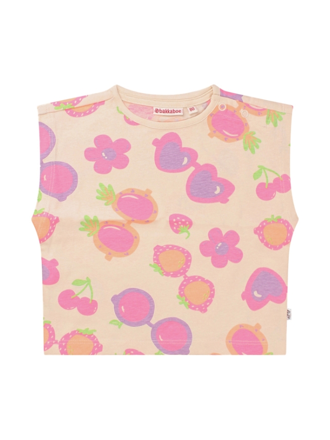Vrolijk zomers T-shirt met neonkleurige zonnebrillen. Let the summer begin! Dit model is een Boxy fit en valt dus wijd. Leuk te combineren op een spijkerbroekje.
