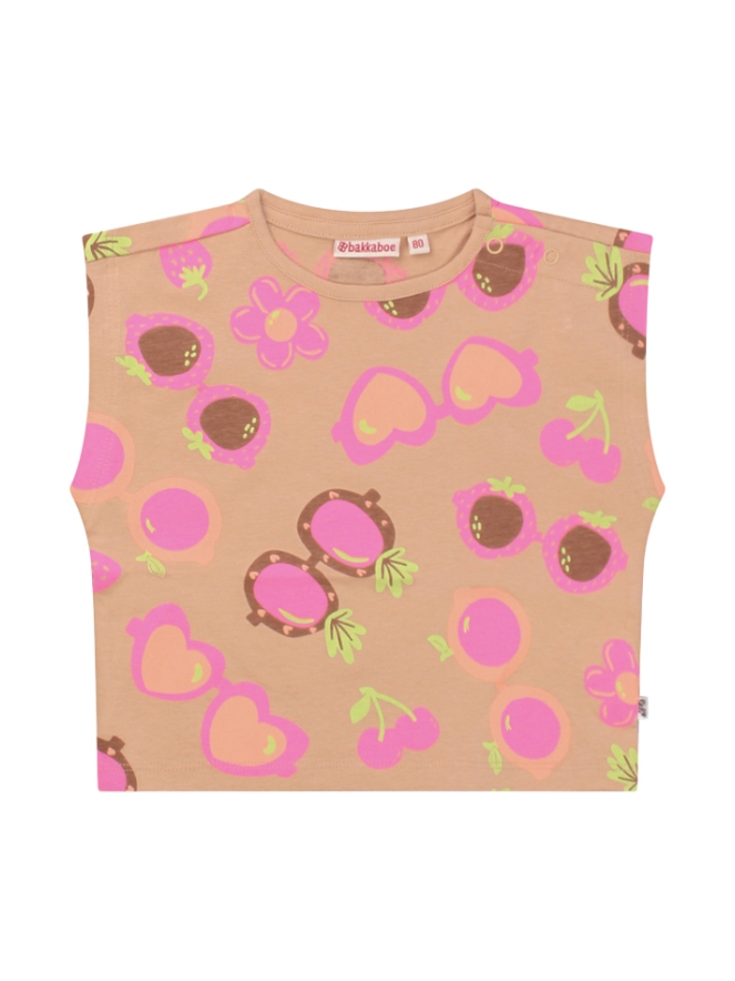 Vrolijk zomers T-shirt met neonkleurige zonnebrillen. Let the summer begin! Dit model is een Boxy fit en valt dus wijd. Leuk te combineren op een spijkerbroekje.