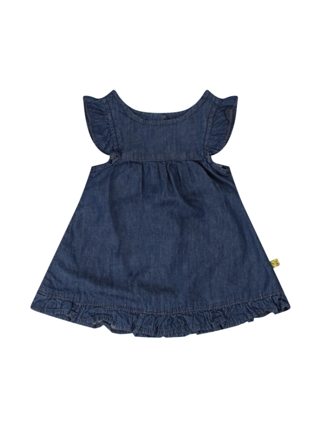 Dit jurkje van soepel vallende en dunne denim heeft over de gehele rug houtlook bloemenknoopjes. Met blote benen bij mooi weer, anders een maillot eronder. Pretty girls wear dresses!
