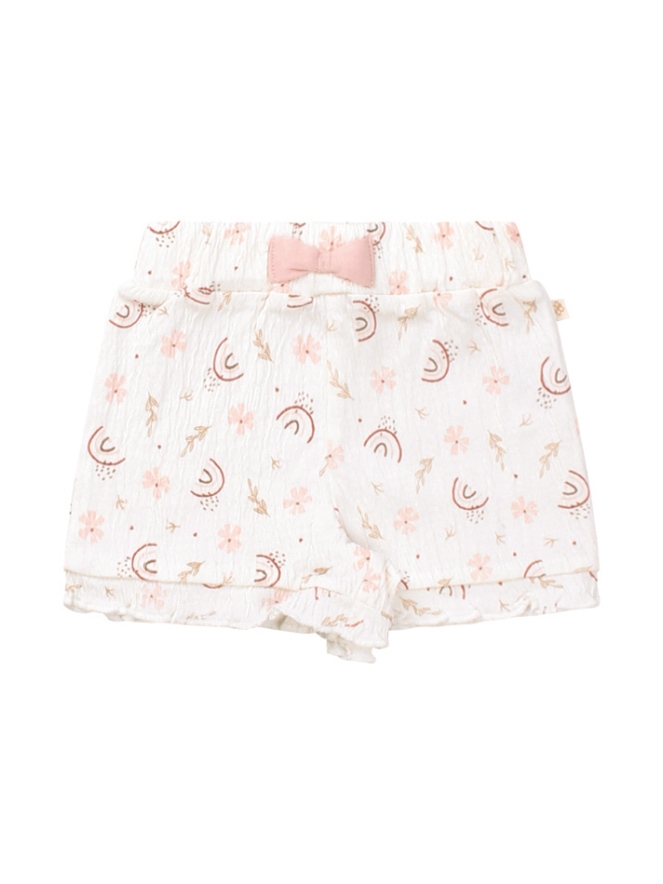 Dit schattige newborn meisjes korte broekje is perfect voor warme dagen! Gemaakt van luchtige bio-crinkle stof met stretch voor extra comfort. De lieve bloem- en regenboogprint maakt het extra zoet. Maak de look compleet met het bijpassende shirtje!