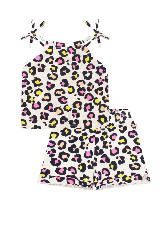 Dit vrolijke pakje bestaande uit een broekje en shirtje met spaghettibandjes is het ultieme co-ord setje voor jouw meisje. Dit leuke setje hebben we in 3 kleuren combinaties. Welke is jouw favoriet?