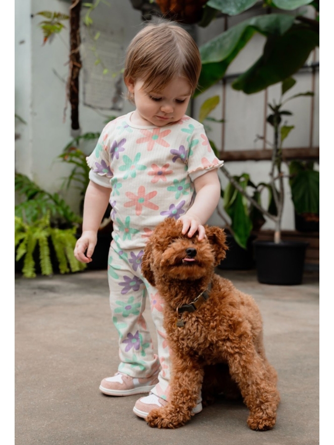 Mega leuk T-shirt met een fijne rib. Dit shirtje heeft lekker veel stretch en een te gekke print. Ga jij voor hartjes of bloemen? Voor de co-ord fans hebben we een bijpassende flair broek onder art.nr. Z90376
