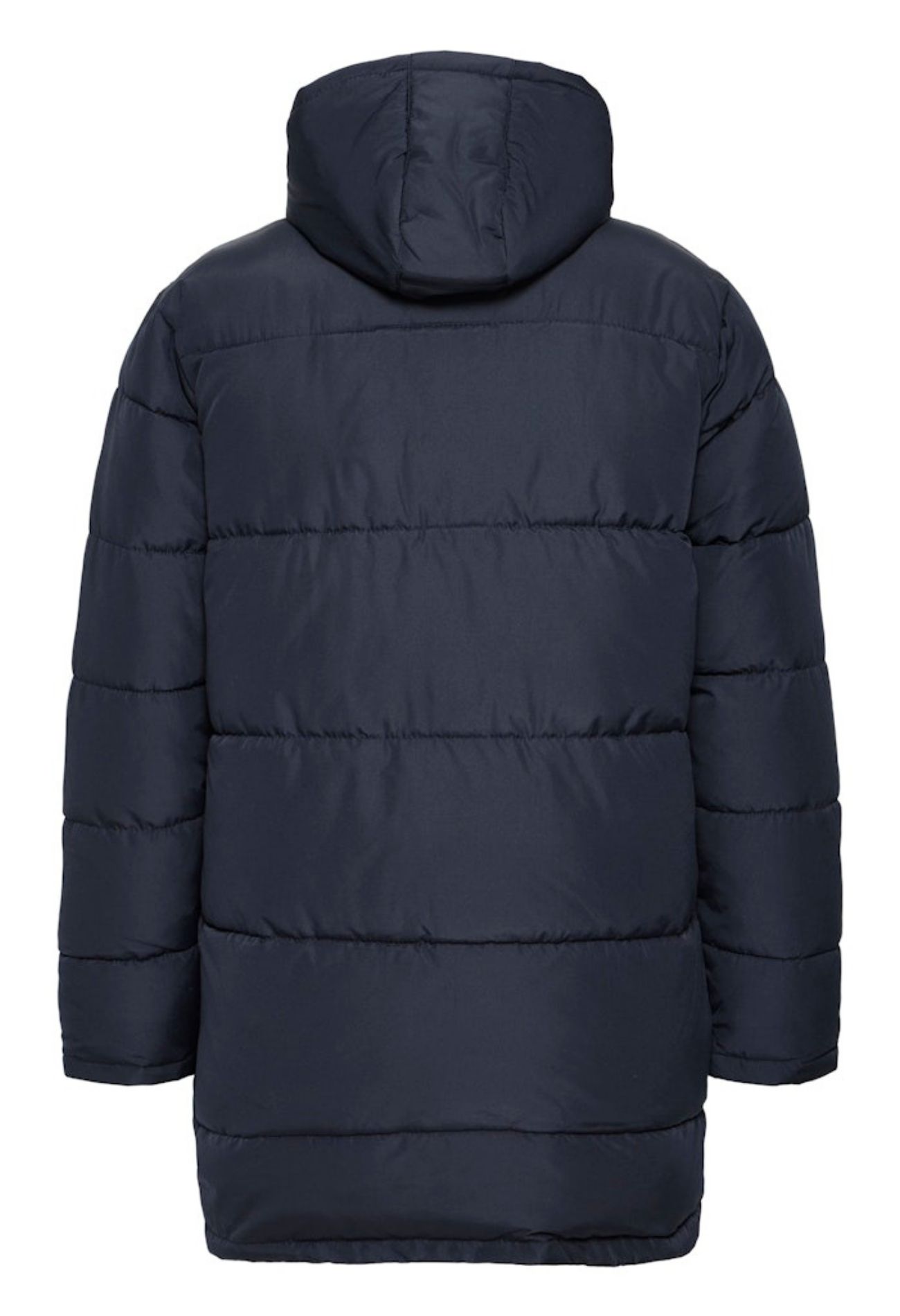 Diep donkerblauwe parka van Blend met vaste capuchon, grote klepzakken en steekzakken voorop. Tijdloos, warm en casual!