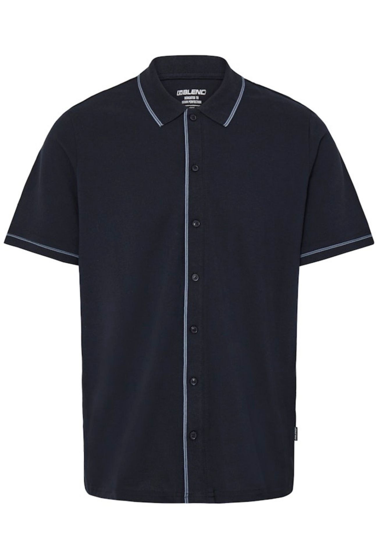 Deze stijlvolle donkerblauwe polo voor heren combineert het nette van een blouse met het comfort van een klassieke polo. Het doorknoopmodel geeft een verfijnde uitstraling en maakt de polo veelzijdig: draag hem casual open op een jeans of volledig dichtgeknoopt voor een meer geklede look.