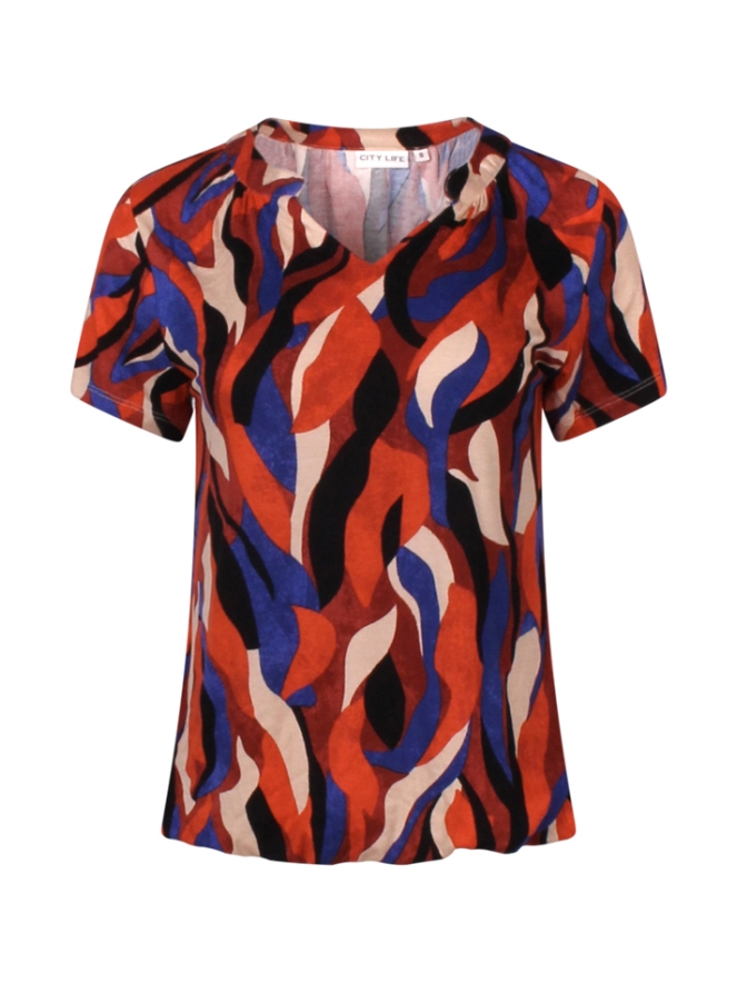 Kleurrijk T-shirtje van jerseykatoen. Rekt lekker mee en heeft een elastiek onder in de taille. Dit shirtje heeft een kleine V hals en leent zich uitstekend voor uitstapjes, blokjes om op de fiets, boodschappen, feestjes, werk of gewoon lekker thuis in de tuin of op de bank.