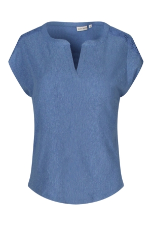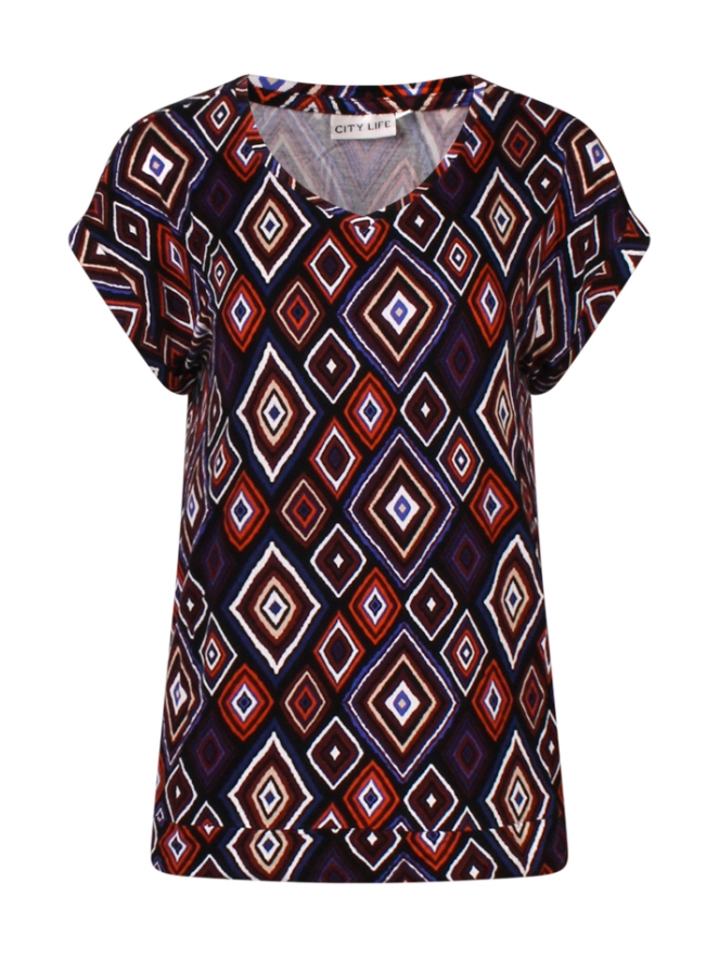 Dit T-shirtje met wiebertjes print heeft een kleine V-hals. Met een vaste omslag in de mouw. Doet het goed op een effen gekleurde broek, lang, kort of driekwart.