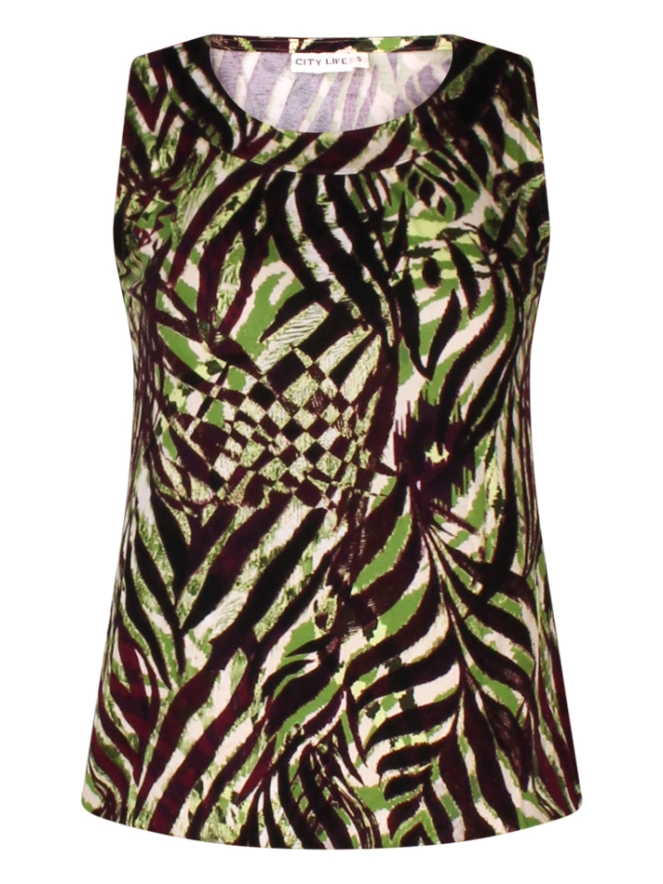 Weer zo'n leuke singlet met opvallende print. Dit exemplaar heeft een elastiek in de taille waarmee je het shirt makkelijk iets laat bollen. Leuk te combineren met vele broeken en ook leuk onder een blazer.