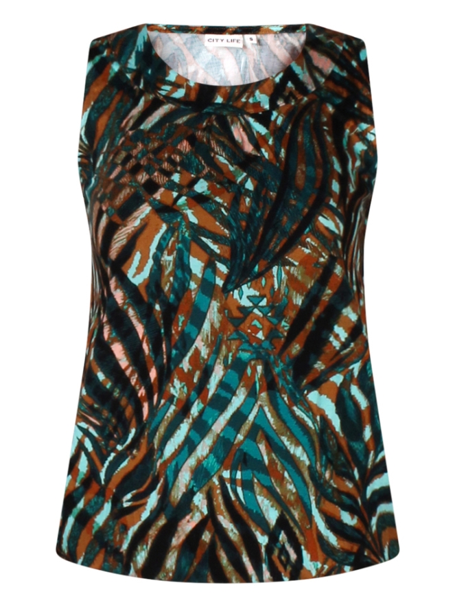 Weer zo'n leuke singlet met opvallende print. Dit exemplaar heeft een elastiek in de taille waarmee je het shirt makkelijk iets laat bollen. Leuk te combineren met vele broeken en ook leuk onder een blazer.