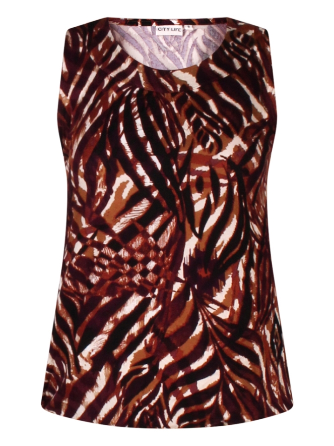 Weer zo'n leuke singlet met opvallende print. Dit exemplaar heeft een elastiek in de taille waarmee je het shirt makkelijk iets laat bollen. Leuk te combineren met vele broeken en ook leuk onder een blazer.