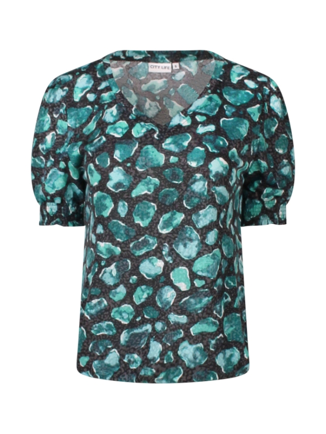 Leuk dun T-shirtje met opvallende print. Dit shirtje heeft een lichte pofmouw met elastiek aan het uiteinde. Ook zit er een elastiek in de taille. Let op, dit shirtje schijnt iets door.