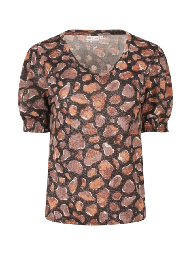 Leuk dun T-shirtje met opvallende print. Dit shirtje heeft een lichte pofmouw met elastiek aan het uiteinde. Ook zit er een elastiek in de taille. Let op, dit shirtje schijnt iets door.