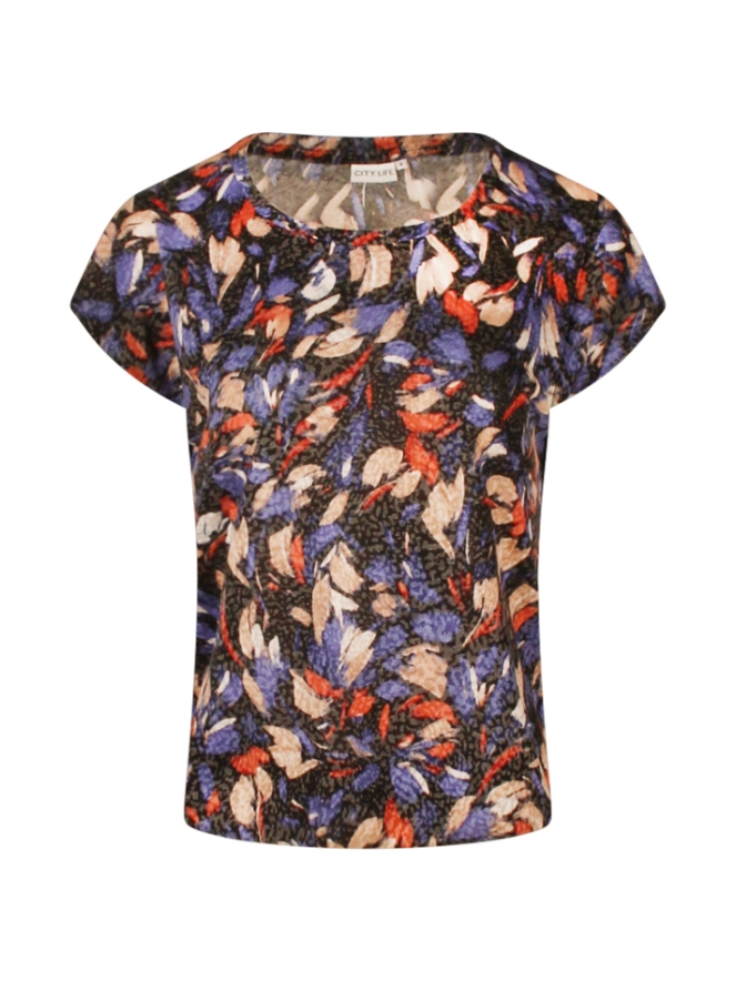 Vrolijk shirtje met een kleurrijk vegenpatroon. Met een elastiek in de taille om het shirt te laten bollen. Dit shirtje is licht doorschijnend want hij is dun en luchtig!