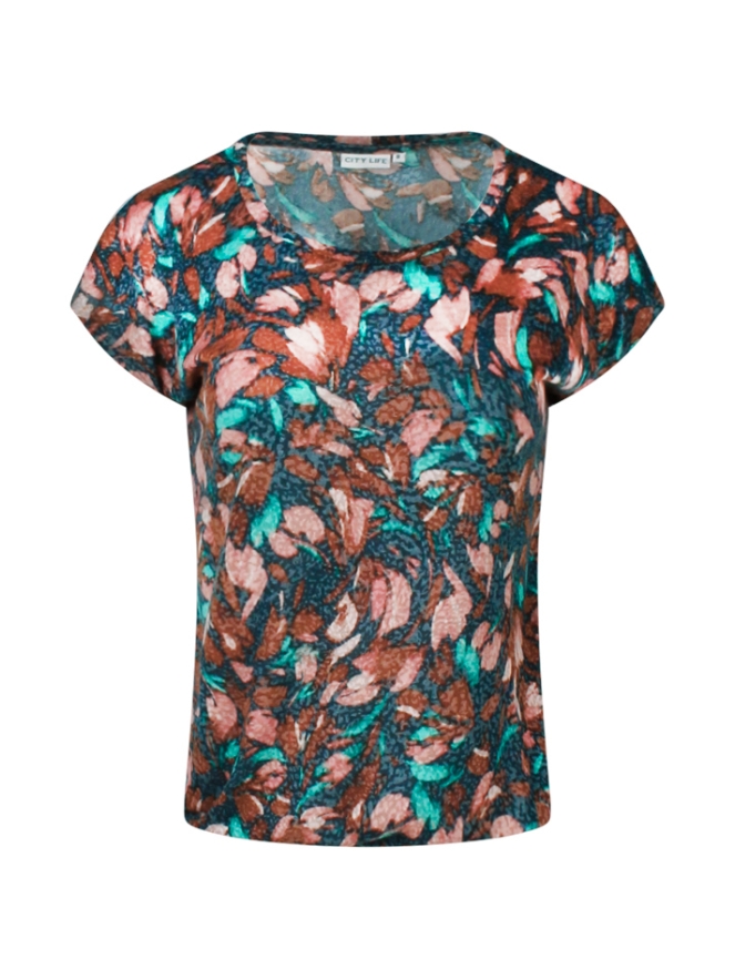 Vrolijk shirtje met een kleurrijk vegenpatroon. Met een elastiek in de taille om het shirt te laten bollen. Dit shirtje is licht doorschijnend want hij is dun en luchtig!