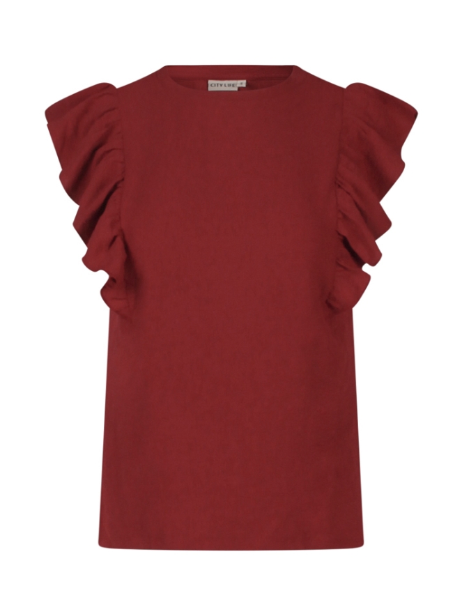 Lekkere vlotte singlet met grote ruche over de schouder. Lijkt op een mouw maar is het niet. Verder geen poespas. Alleen dat. Draag er een stoere denim korte broek onder met een vlotte sneaker en je bent Hip to Go!