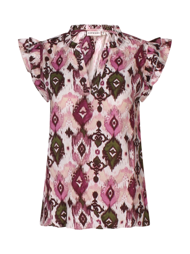 Deze dames top heeft een vrolijke aquarel ikat print die perfect past bij het zomerse seizoen. De speelse ruche op de schouder geeft de top een vrouwelijke en luchtige uitstraling. Draag hem met de bijpassende broek (W10023) voor een complete look, of combineer hem met een denim rok voor een meer casual outfit.