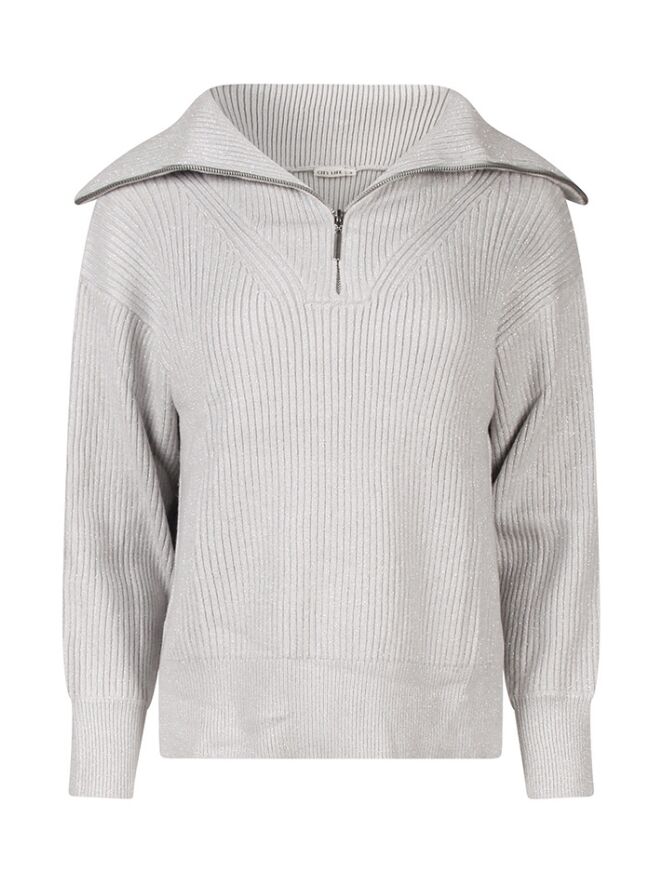 Deze rib gebreide trui heeft een echte schipperstrui look. Met heerlijke warme dicht te ritsen kol. In het garen zit een lurex glitterdraad verweven wat deze trui echt anders maakt.