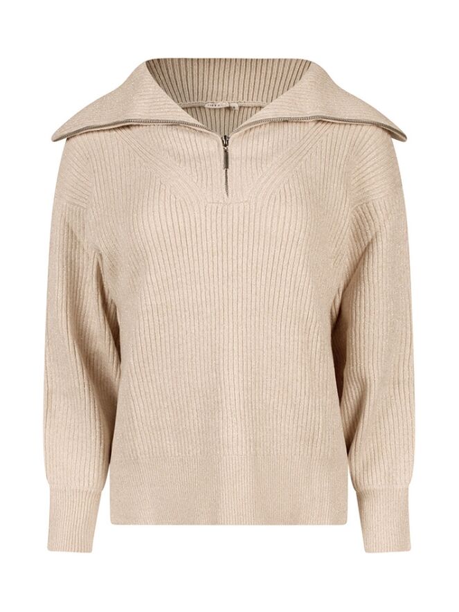 Deze rib gebreide trui heeft een echte schipperstrui look. Met heerlijke warme dicht te ritsen kol. In het garen zit een lurex glitterdraad verweven wat deze trui echt anders maakt.