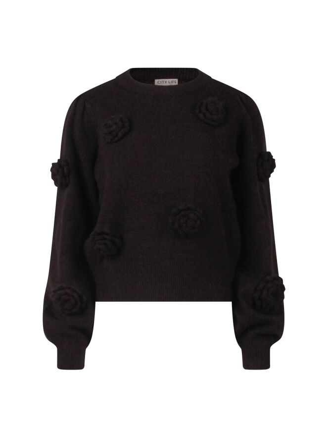 Deze gebreide damestrui is een echte eyecatcher dankzij de sierlijke opgestikte bloemen en de elegante pofmouwen. Het speelse design geeft je outfit een romantische twist, terwijl de zachte knit zorgt voor een comfy fit. Draag hem op een jeans voor een casual look met een vrouwelijke touch, of combineer met een rok voor een meer geklede stijl.