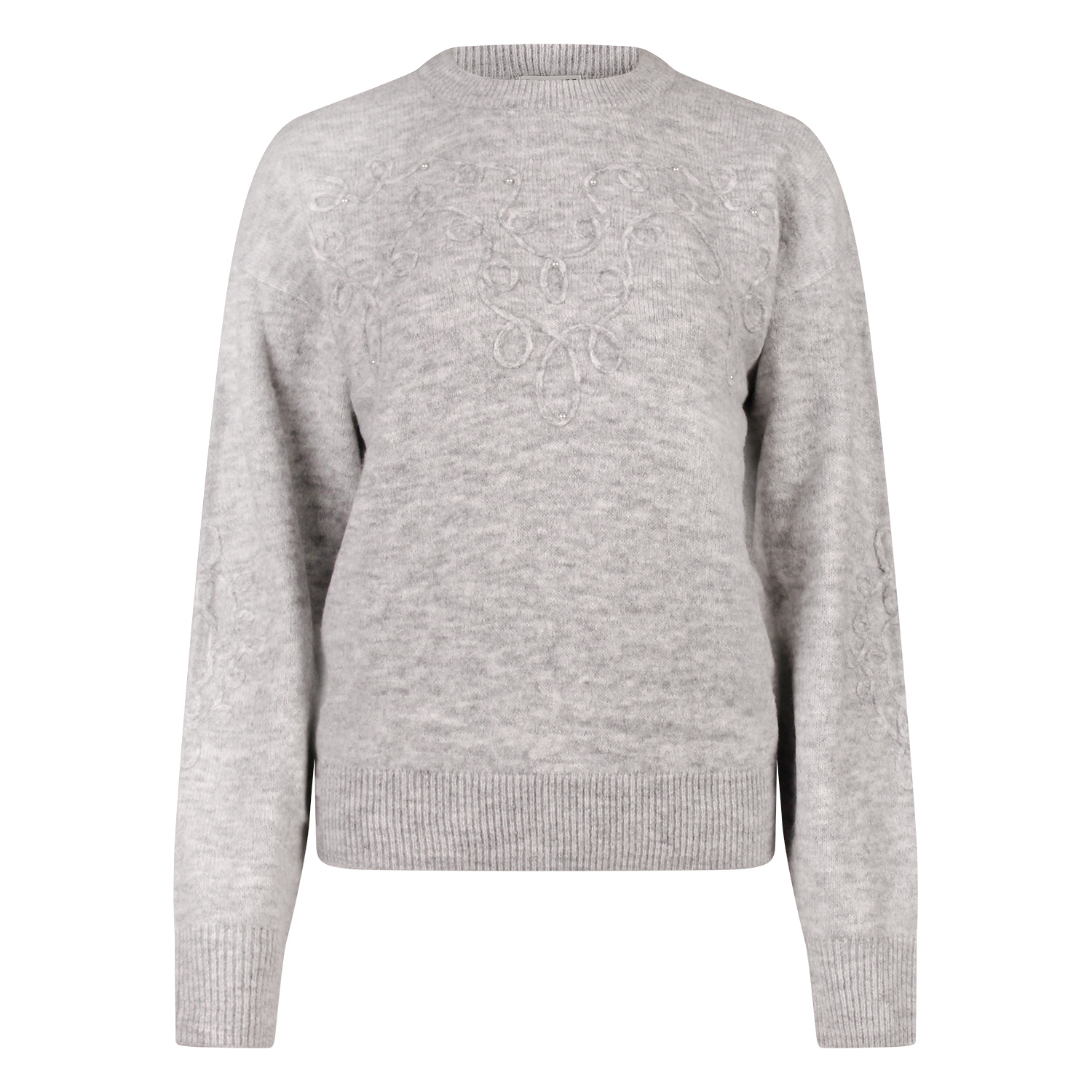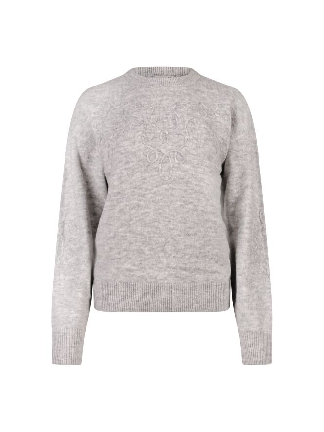 Deze heerlijk warme damestrui is gebreid van een zachte kwaliteit en afgewerkt met sierlijk opgestikt lint, dat zowel aan de voorkant als op de mouwen terugkomt. Her en der zijn kleine parels toegevoegd voor een subtiele glans en vrouwelijke touch. Perfect om te dragen op een jeans voor een cosy, maar elegante look met oog voor detail.