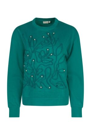 Deze heerlijk warme damestrui is gebreid van een zachte kwaliteit en afgewerkt met sierlijk opgestikt lint, dat zowel aan de voorkant als op de mouwen terugkomt. Her en der zijn kleine parels toegevoegd voor een subtiele glans en vrouwelijke touch. Perfect om te dragen op een jeans voor een cosy, maar elegante look met oog voor detail.