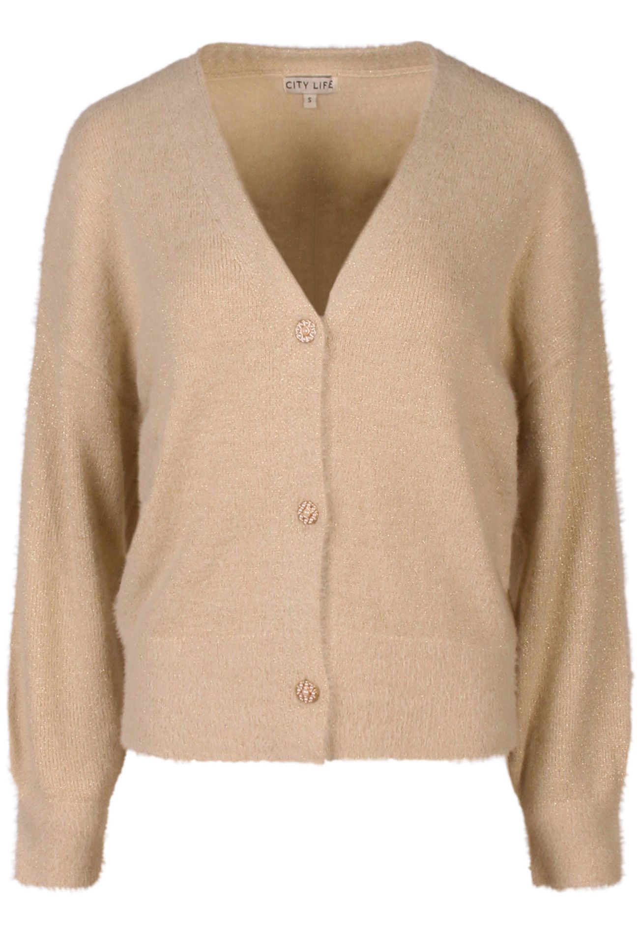 Voeg een vleugje glamour toe aan je outfit met dit charmante damesvest van featheryarn en lurex. De subtiele glans van het lurexdraad zorgt voor een verfijnde sparkle, terwijl de zachte featheryarn een heerlijk draagcomfort biedt. De blikvangers? De fancy knopen in bloemvorm, afgewerkt met parels als sierlijke blaadjes. Een elegant detail dat het vest net dat beetje extra geeft.