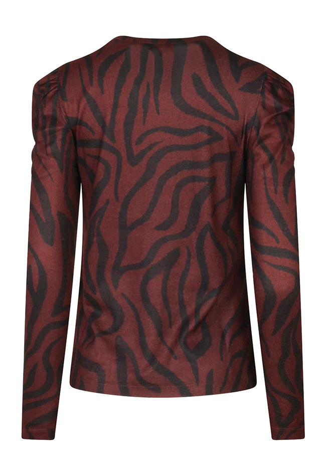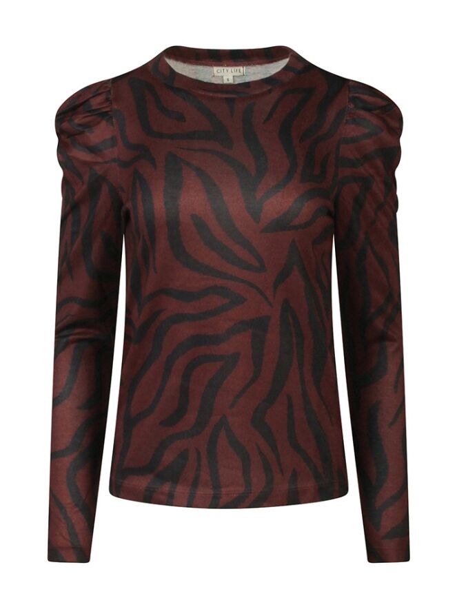Dunne gebreide top met opvallende zebra print. Met een pofmouwtje. Leuk te combineren met een giletje of blazer.