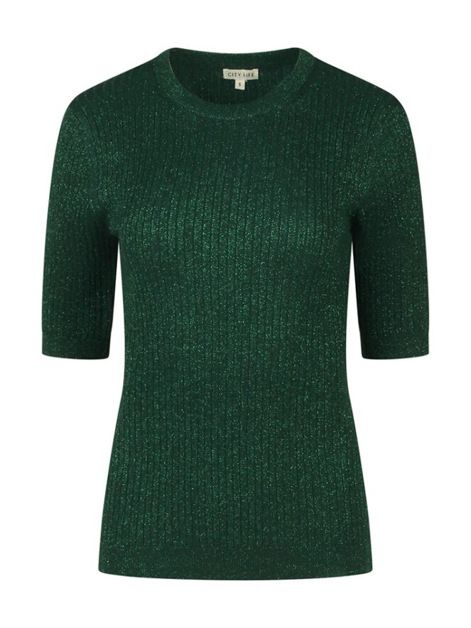 Dit ribgebreide shirt met korte mouw is de perfecte mix van comfort en feestelijke flair. Dankzij de subtiele lurexdraad krijgt het shirt een sprankelende glitter die het net dat beetje extra geeft. Draag ?m op een jeans voor een casual-chique look of combineer met een rok voor een feestelijke outfit. Ideaal voor de feestdagen of een avondje uit!