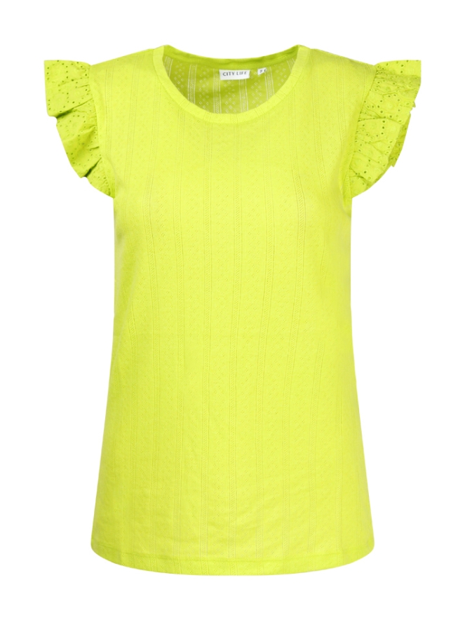 T-shirt met korte mouw van City Life. Dit shirt heeft een ronde hals en vlindermouwen met ruche van broderie. Dit shirt heeft veel stretch door de jersey ajour stof.