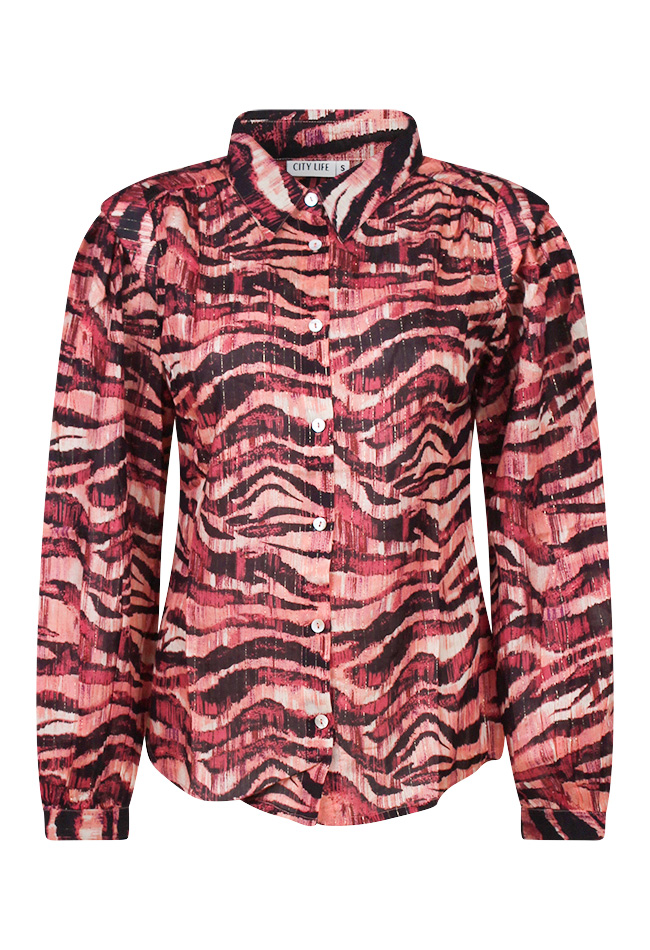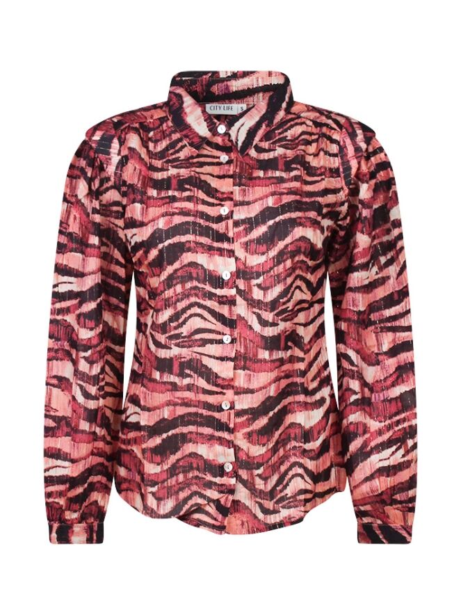 Getailleerde blouse met een all-over zebra print, verweven met subtiel lurexdraad voor een vleugje glamour. Deze blouse heeft een kraagje en wordt aan de voorkant gesloten met knopen. De blouse heeft een pofmouw/kap mouw. De manchet is verstelbaar met twee knoopjes. Een lichte rimpel op de schouder aan de voorkant voegt een elegant detail toe aan deze stijlvolle blouse.