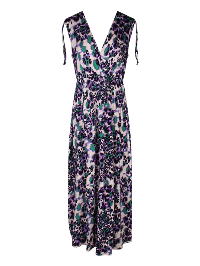 Deze zomerse damesjurk draagt net zo comfortabel als je favoriete T-shirt. Met zowel een V-hals aan de voor- als achterkant straalt deze jurk een tijdloze elegantie uit, terwijl de gekleurde panterprint een speelse en trendy twist toevoegt. De smock elastische tailleband zorgt voor een verfijnde pasvorm. Stijl het met je favoriete sandalen en een zonnehoed voor een relaxte strandlook, of combineer het met hakken voor een avondje uit.