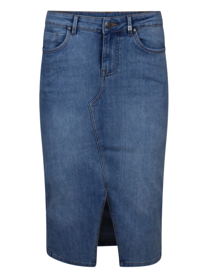 Modieuze rok, lang model met een split aan de voorkant. Deze rok is een 5-pocket model en bestaat voor 27% uit gerecyclede plastic flesjes en dus milieubewust! Makkelijk te combineren met een leuk laarsje, stoere boot of ga je liever voor een sportieve sneaker? Het kan allemaal!