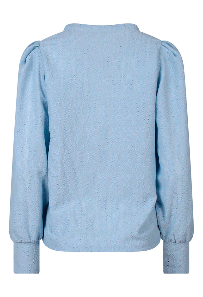 Prachtige ajour top met lange mouwen, een pofmouw en een nette V-hals. Draagt leuk onder een colbert of spijkerjasje maar kan natuurlijk ook zo gewoon ontzettend stijlvol gedragen worden.