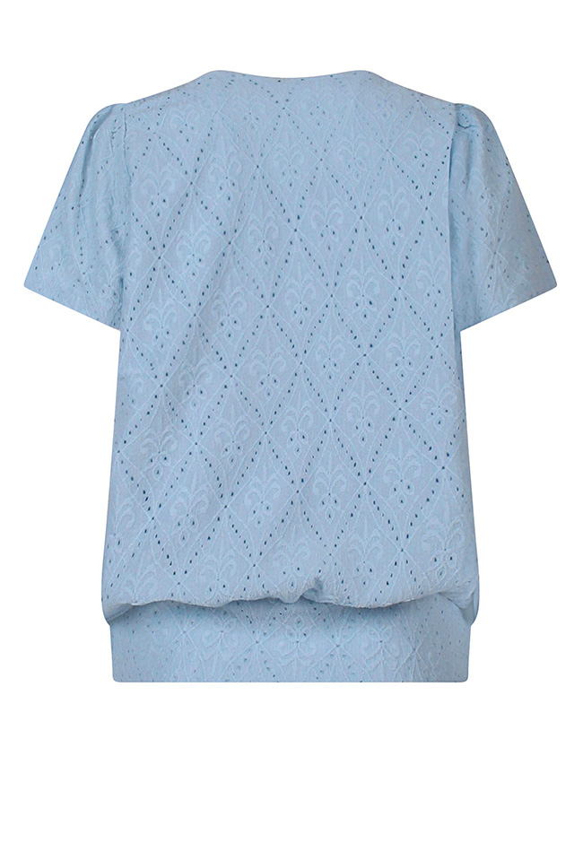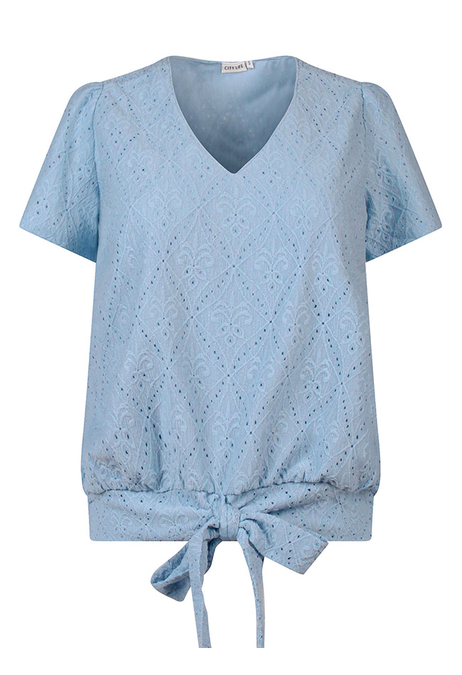 Prachtige top van ajour. Deze schijnt niet door omdat hij dubbele stof heeft. Toppie! Met een mooie V-hals en als extra detail een strikband in de taille.