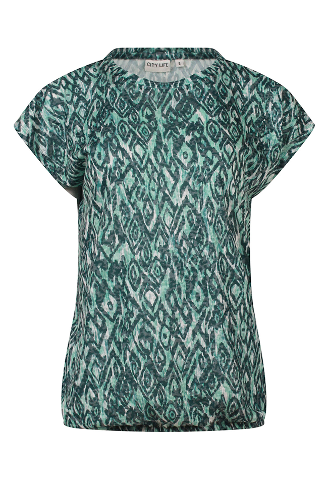 Dit casual T-shirt met korte mouwen combineert comfort met een eigentijdse stijl. Het shirt is voorzien van een opvallende grafische print en een aantrekkelijke kleurenmix. Dankzij het elastische taillebandje krijgt het shirt een flatterende pasvorm die zich subtiel aan je lichaam aanpast. Perfect te combineren met jeans, shorts of een casual rok voor een moderne, veelzijdige look.