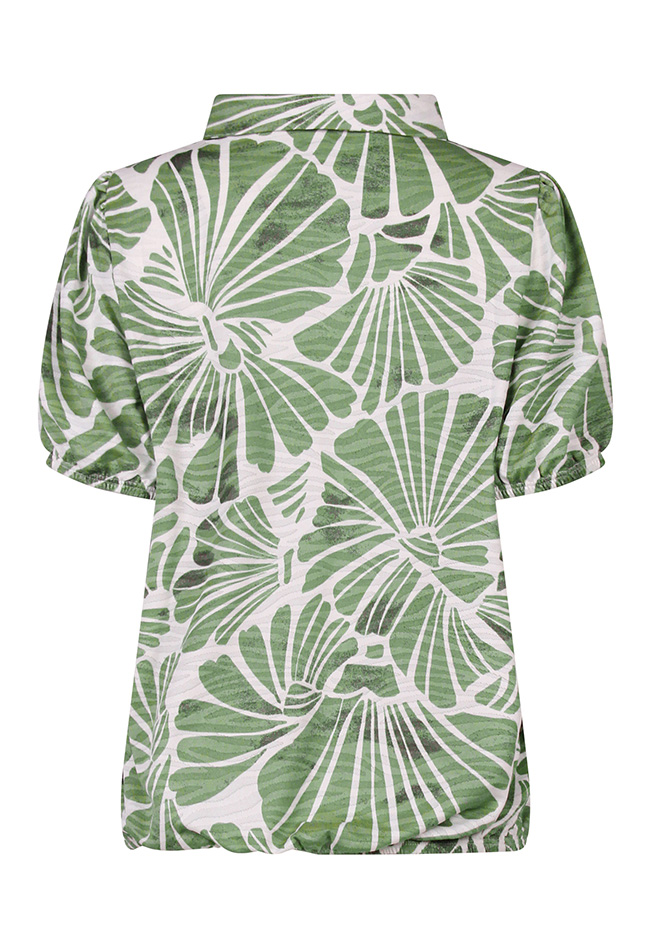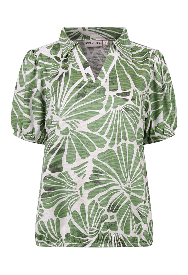 Voeg een speels en elegant accent toe aan je garderobe met deze fraaie damestop. De korte mouwen en het subtiele schelppatroon geven de top een vrouwelijke en zomerse uitstraling, terwijl het elastiek in de taille zorgt voor een flatterende pasvorm en een licht getailleerd effect.
