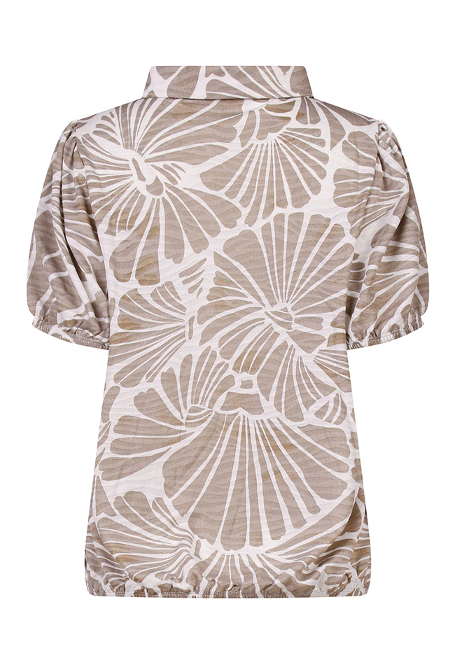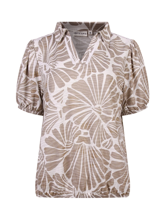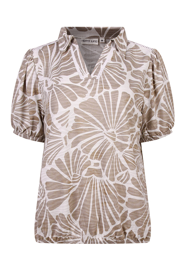 Voeg een speels en elegant accent toe aan je garderobe met deze fraaie damestop. De korte mouwen en het subtiele schelppatroon geven de top een vrouwelijke en zomerse uitstraling, terwijl het elastiek in de taille zorgt voor een flatterende pasvorm en een licht getailleerd effect.