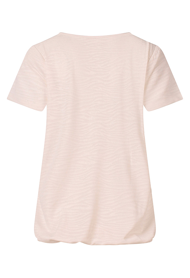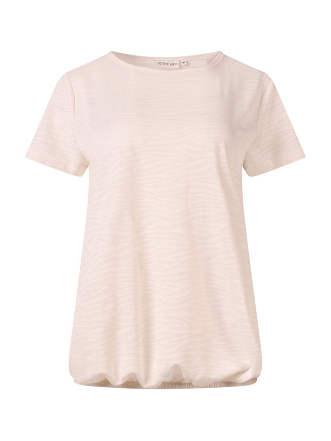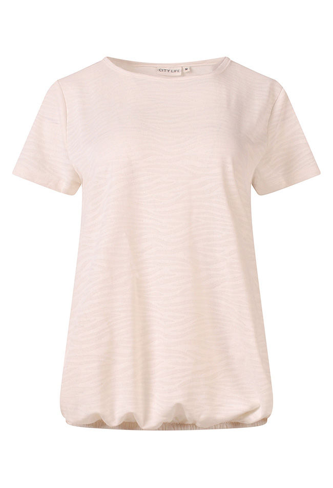 Dun T-shirtje van polyester met een subtiele zebraprint. Dit shirtje heeft een elastiekje in de taille zodat je het shirt iets kunt laten bollen. Eenvoudig te combineren met een vlotte korte of lange broek.