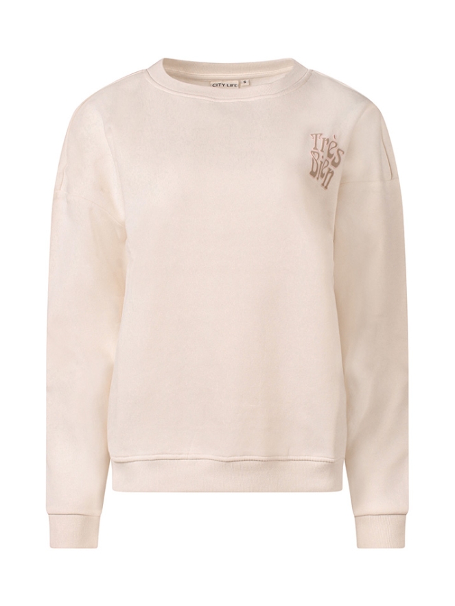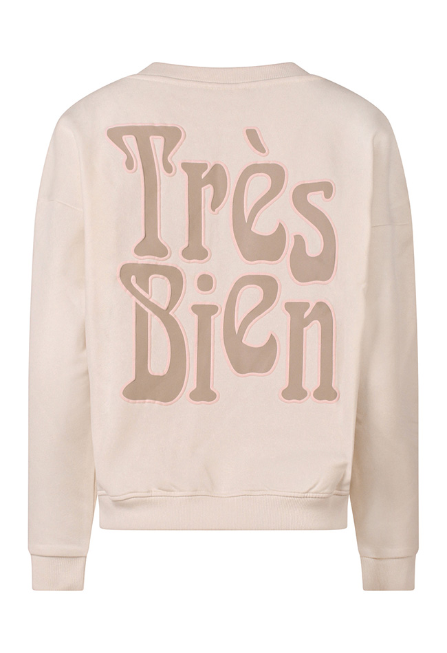 Tres Bien! Deze ontzettend zachte sweater is met fleece aan de binnenkant en trek je het liefst nu gelijk aan! Met mooie grote trendy print op de rug in te leuke voorjaarskleurtjes!