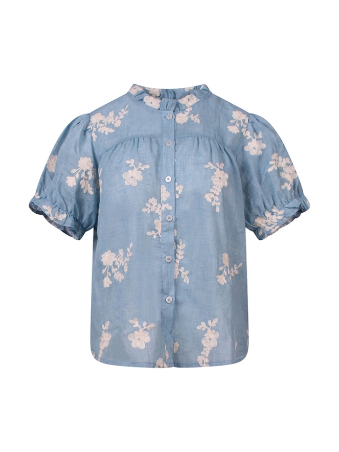 Een blousje dat romantiek, stijl en comfort moeiteloos samenbrengt, perfect voor zomerse dagen of een elegante casual look. Dit 100% katoenen doorknoopblousje voelt heerlijk licht aan en heeft een linnen-look die casual chic combineert met natuurlijke elegantie. De korte pofmouwtjes en de ruche rond de kraag geven het blousje een zachte, romantische uitstraling.