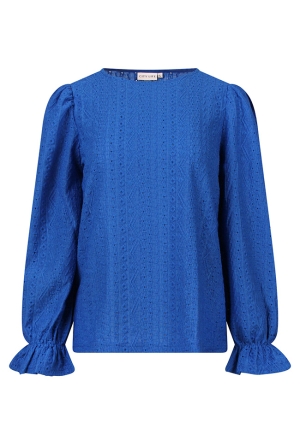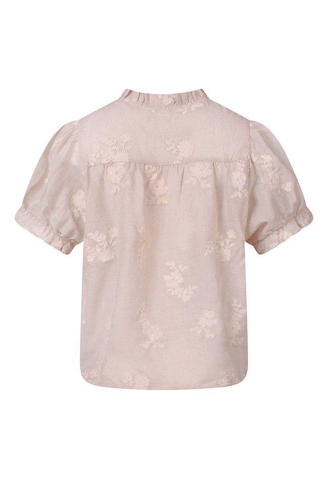 Een blousje dat romantiek, stijl en comfort moeiteloos samenbrengt, perfect voor zomerse dagen of een elegante casual look. Dit 100% katoenen doorknoopblousje voelt heerlijk licht aan en heeft een linnen-look die casual chic combineert met natuurlijke elegantie. De korte pofmouwtjes en de ruche rond de kraag geven het blousje een zachte, romantische uitstraling.