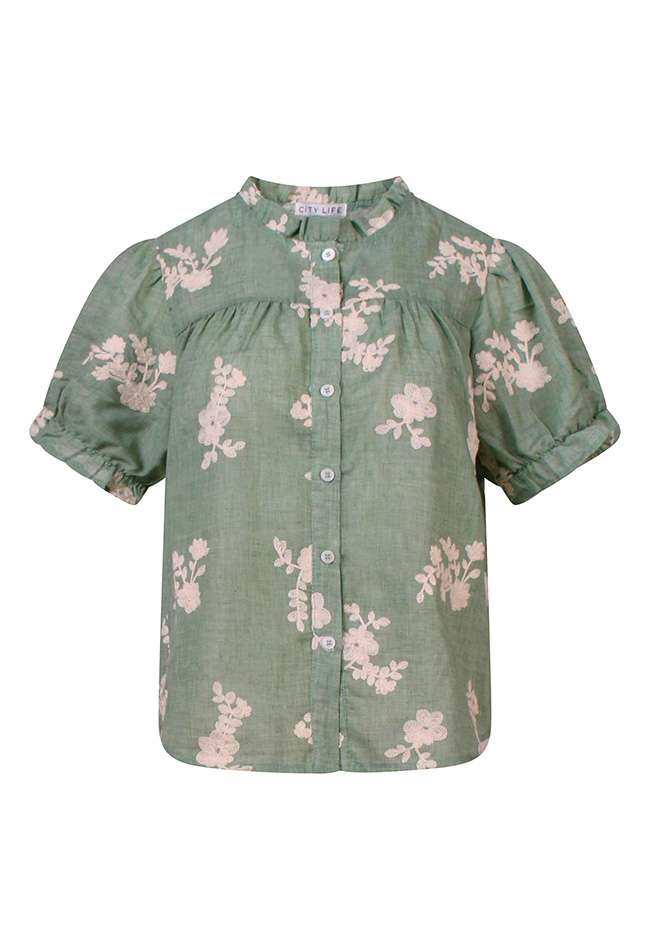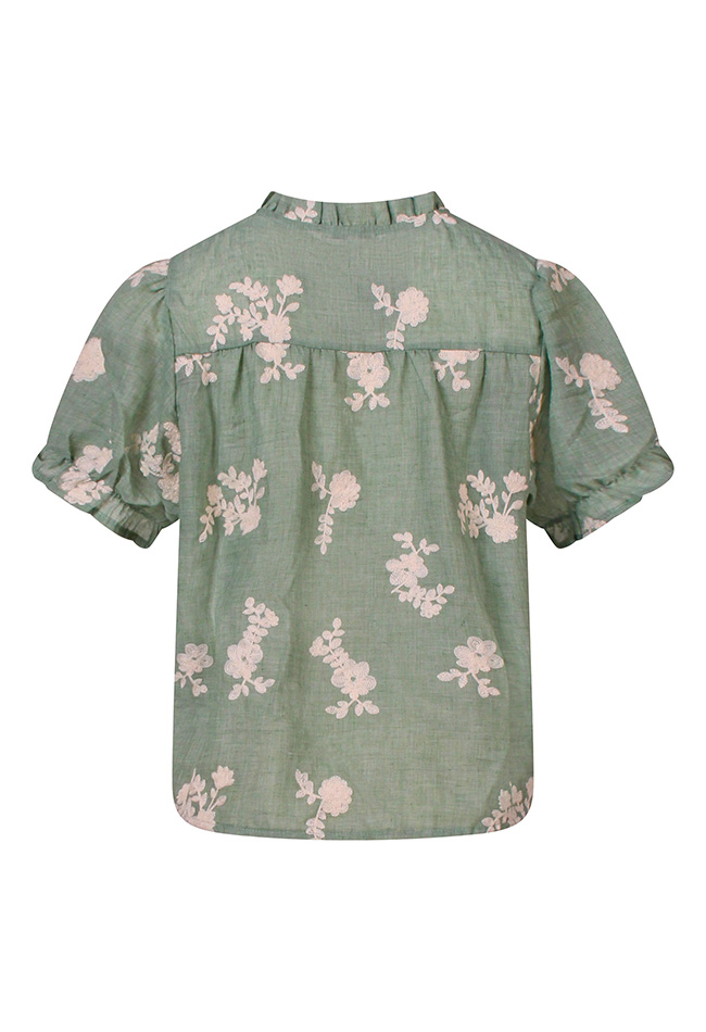 Een blousje dat romantiek, stijl en comfort moeiteloos samenbrengt, perfect voor zomerse dagen of een elegante casual look. Dit 100% katoenen doorknoopblousje voelt heerlijk licht aan en heeft een linnen-look die casual chic combineert met natuurlijke elegantie. De korte pofmouwtjes en de ruche rond de kraag geven het blousje een zachte, romantische uitstraling.