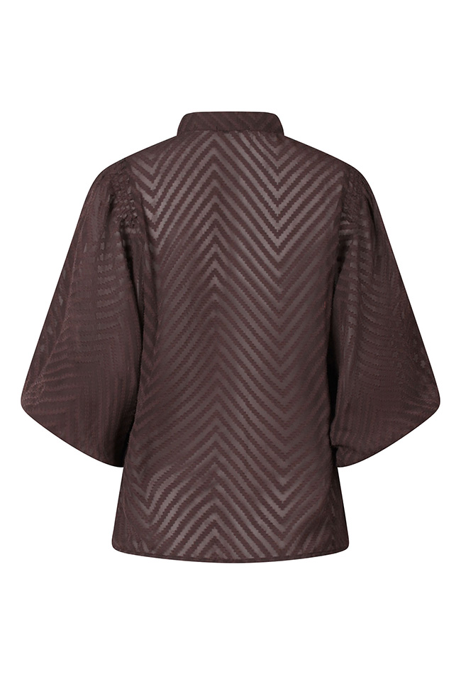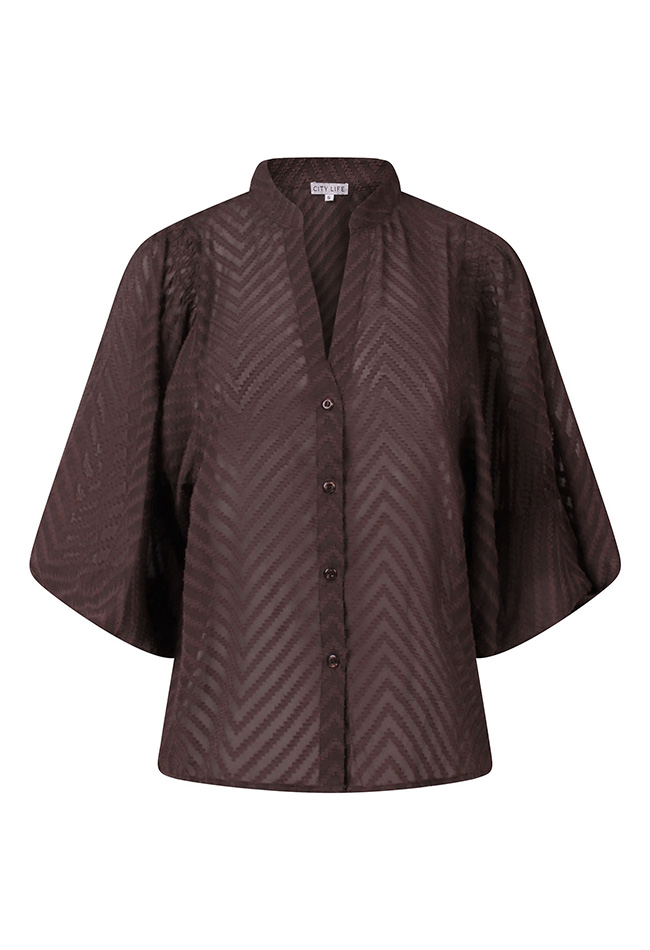 Deze doorschijnende blouse, uitgevoerd in een luchtige stof met een opvallend groot zigzagpatroon is een parel ansich! De V-hals zorgt voor een flatterende, elegante look, terwijl de ballonmouwen een zachte, romantisch volume toevoegen. De blouse is perfect om te dragen over een top of hemdje, waardoor het een veelzijdige keuze is voor zowel casual als meer geklede looks. De comfortabele pasvorm is ideaal voor lente- en zomerdagen.