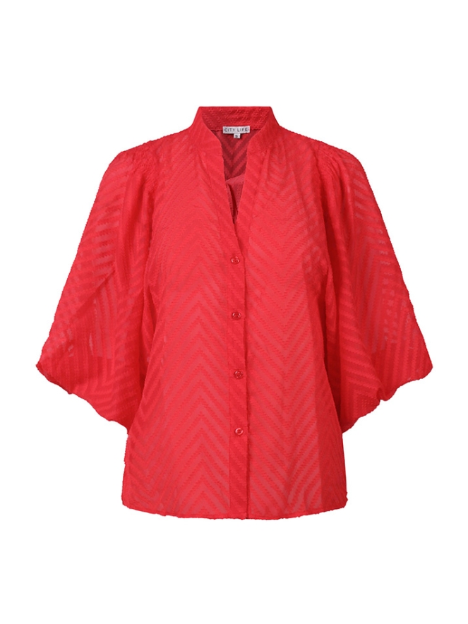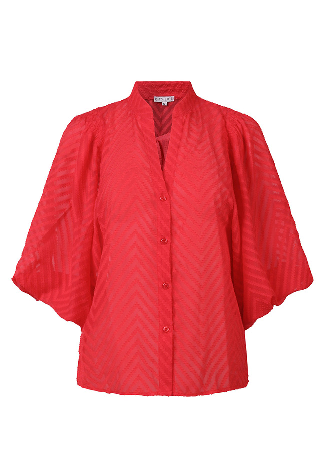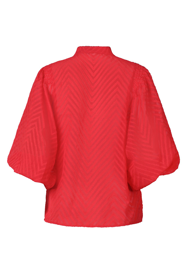 Deze doorschijnende blouse, uitgevoerd in een luchtige stof met een opvallend groot zigzagpatroon is een parel ansich! De V-hals zorgt voor een flatterende, elegante look, terwijl de ballonmouwen een zachte, romantisch volume toevoegen. De blouse is perfect om te dragen over een top of hemdje, waardoor het een veelzijdige keuze is voor zowel casual als meer geklede looks. De comfortabele pasvorm is ideaal voor lente- en zomerdagen.