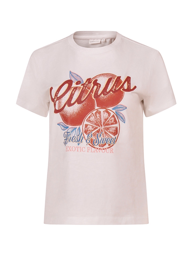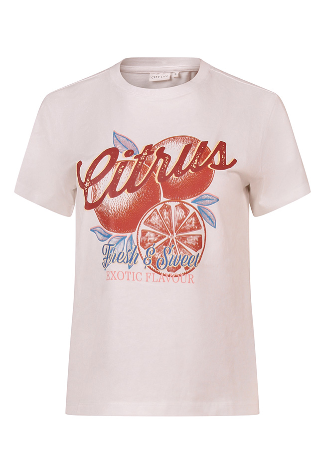 Leuk zomers T-shirt met een grote citrus fruitprint voorop. Makkelijk te combineren op korte broeken of 3kwart broeken.