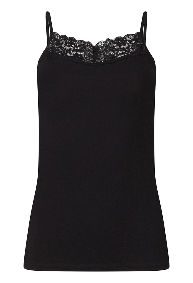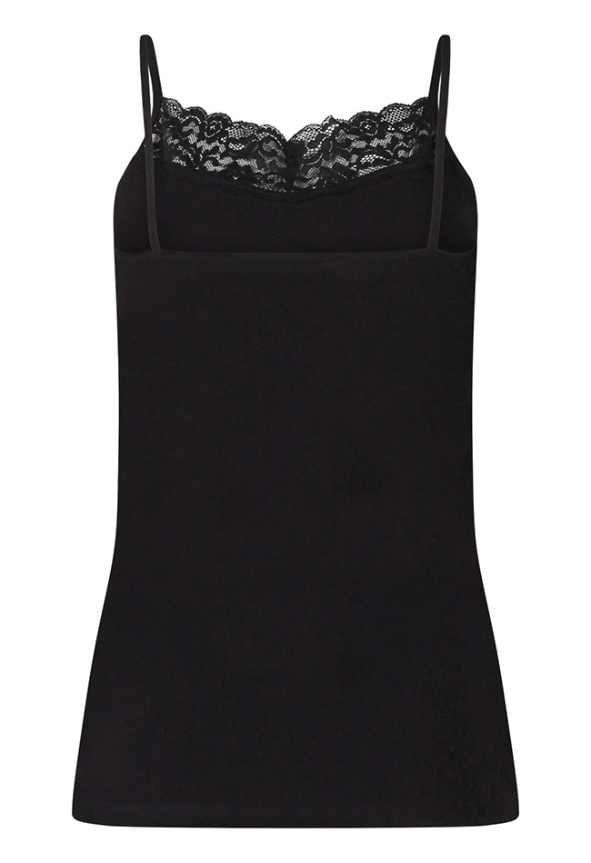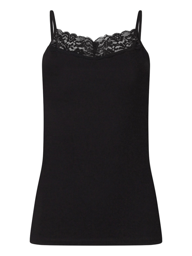De ideale basis is deze zomerse singlet in zwart of ecru. Met spaghettibandjes en een mooie kanten afwerking aan de voorkant. Best Basics bij Jensen Family Shop!