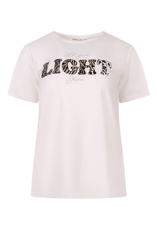 Comfortabel T-shirt met korte mouwen en een inspirerende opdruk: ?Let your light shine?. Gemaakt van zacht en ademend materiaal voor een fijne pasvorm en optimaal draagcomfort. Perfect voor een casual outfit en eenvoudig te combineren met jeans, shorts of een rok. Een stijlvolle en positieve toevoeging aan je garderobe.