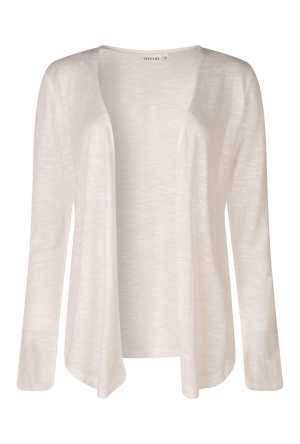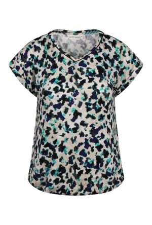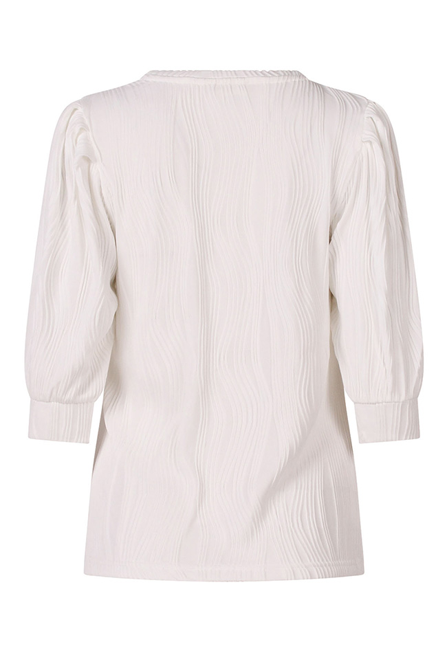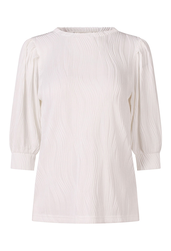 Dames shirt van jacquardstof met een elegant golfpatroon. Het shirt heeft pofmouwen en een klassieke ronde hals, voor een stijlvolle en vrouwelijke look.