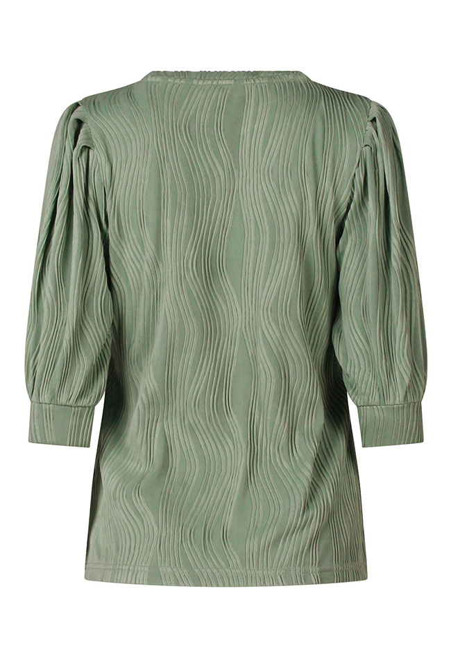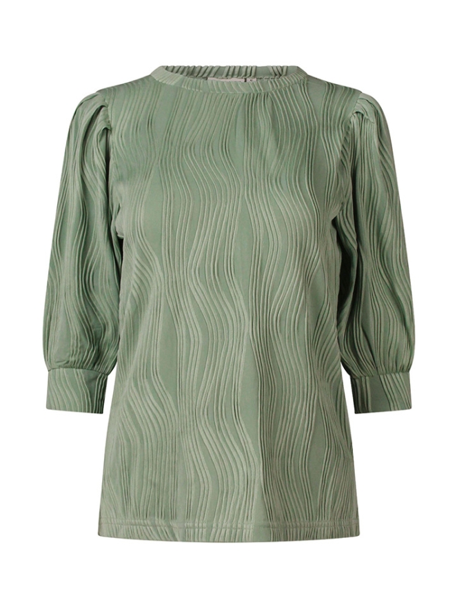 Dames shirt van jacquardstof met een elegant golfpatroon. Het shirt heeft pofmouwen en een klassieke ronde hals, voor een stijlvolle en vrouwelijke look.